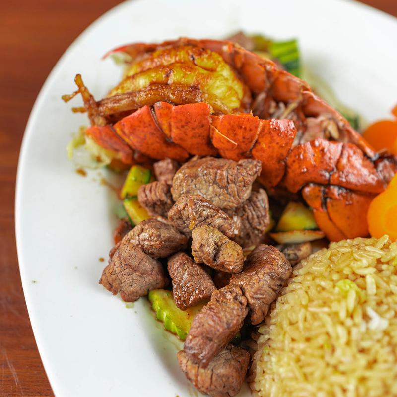 Interactive hibachi dining with skilled chefs preparing meals tableside, including filet, salmon, and shrimp.
