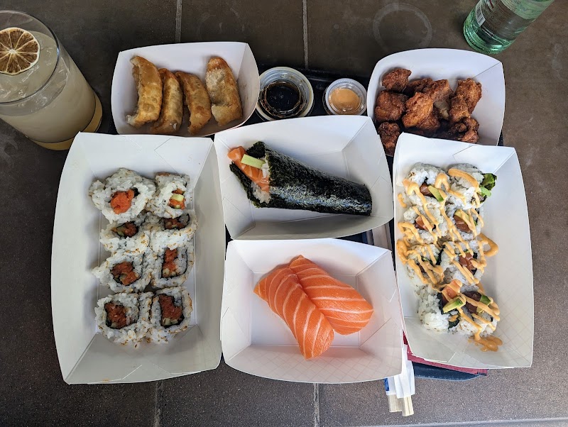 Fresh sushi rolls and starters such as vegetable spring rolls, offering a variety of flavors.