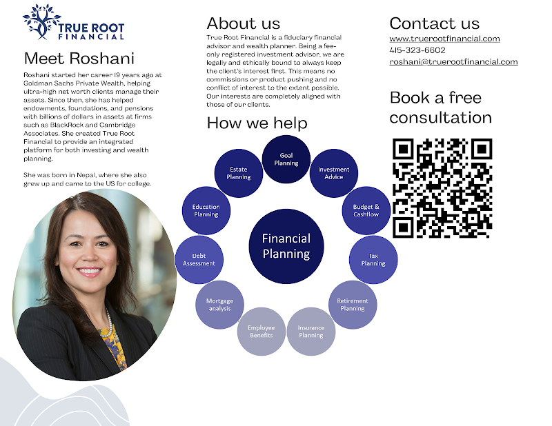 True Root Financial is a premier financial advisory firm in San Francisco, specializing in personalized wealth management and strategic planning. Led by Roshani, we serve tech professionals, physicians, and individuals seeking holistic financial guidance. Our approach combines deep market expertise with a commitment to understanding your unique goals, offering proactive solutions for investments, tax minimization, estate planning, and life transitions. We prioritize accessibility, education, and building long-term client relationships to ensure confidence and peace of mind in your financial journey.