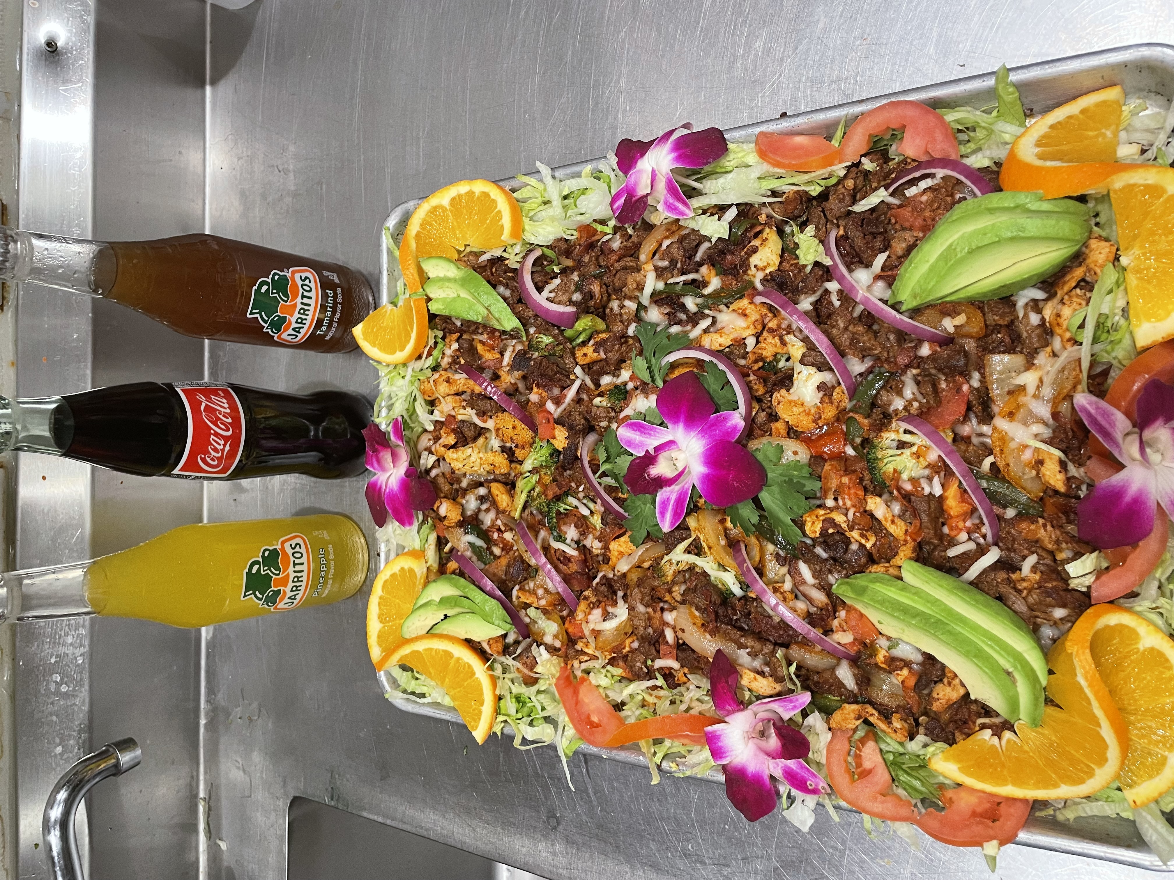 Großzügige Platten mit Optionen wie Lengua (Zunge), Chorizo, Pastor und Birria, serviert mit Bohnen, Reis und frischen Salsas.