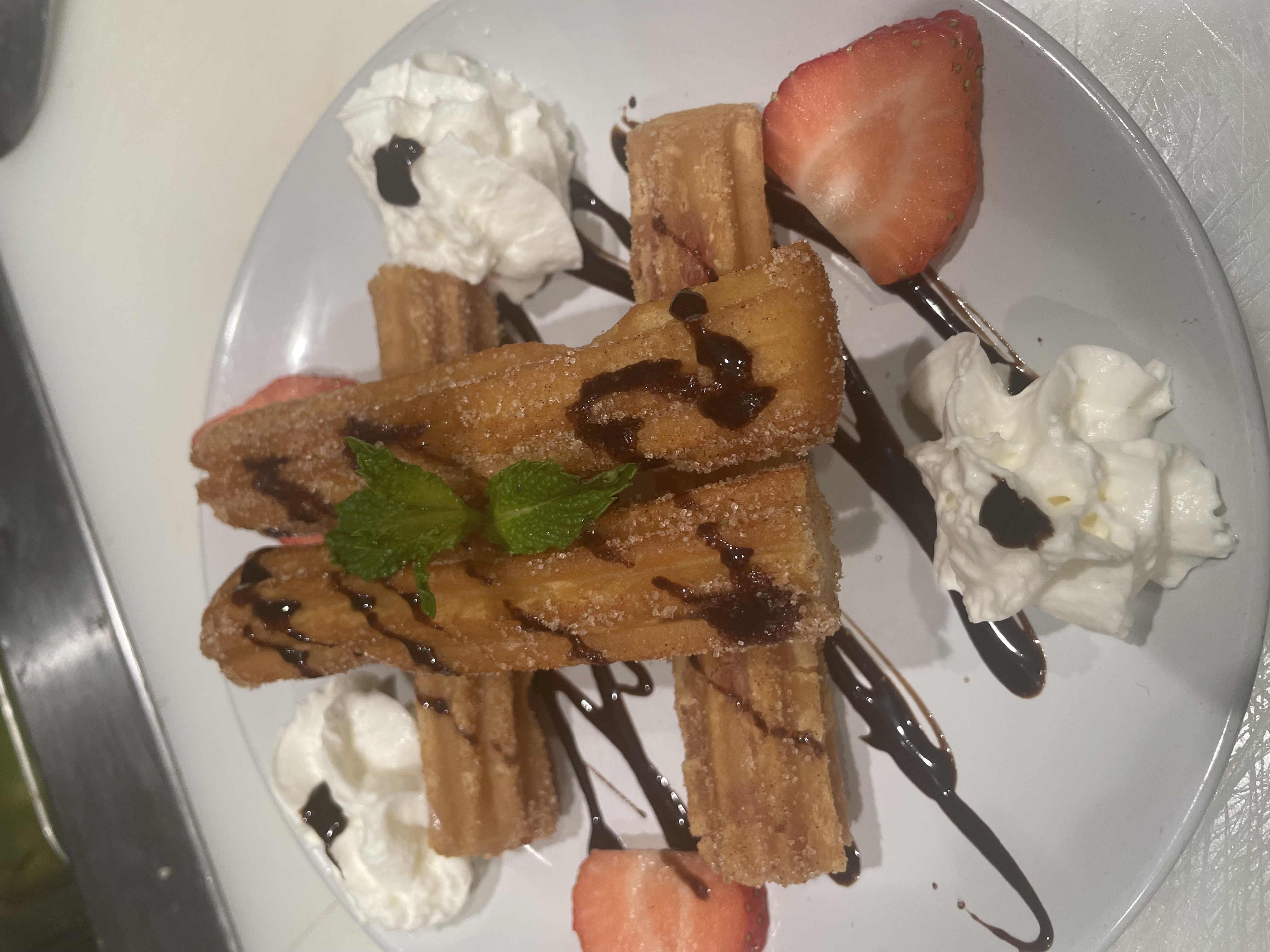 Genieße weiche, knusprige Churros mit Schokoladensauce und cremigen Flan mit karamellisiertem Topping für ein süßes Finale.