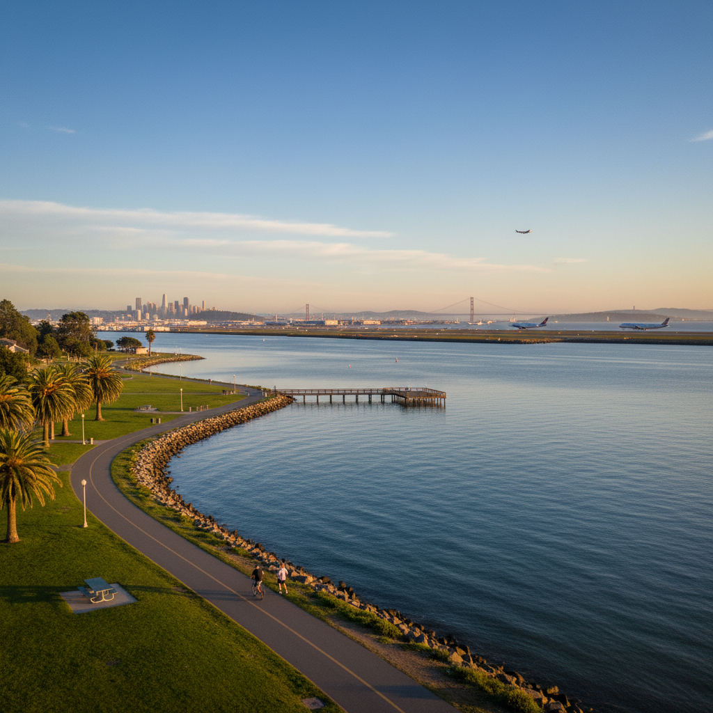 NatureEnjoy stunning views of the San Francisco Bay and SFO runways from Bayside Park and the Anza Lagoon. The Bay Trail is perfect for walking, jogging, or biking along the peaceful shoreline.