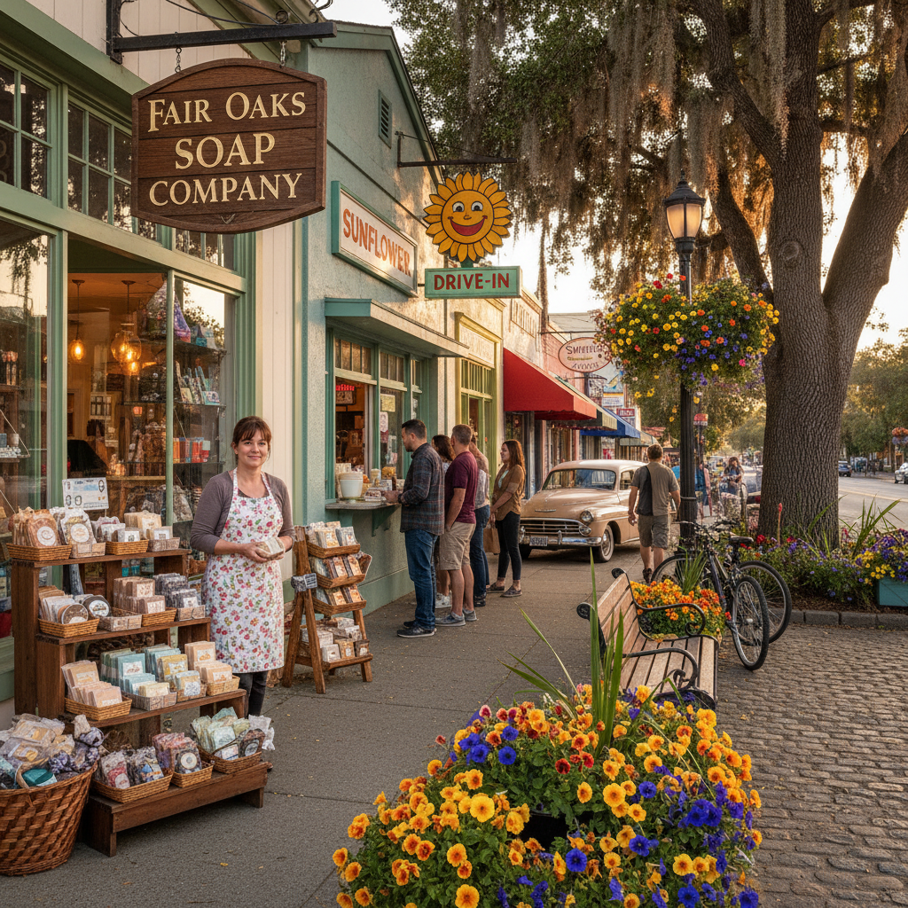 ShoppingDiscover unique local businesses in the historic village, from Fair Oaks Soap Company's handmade products to Sunflower Drive-In's nostalgic burgers and shakes. Each shop reflects the town's independent spirit.
