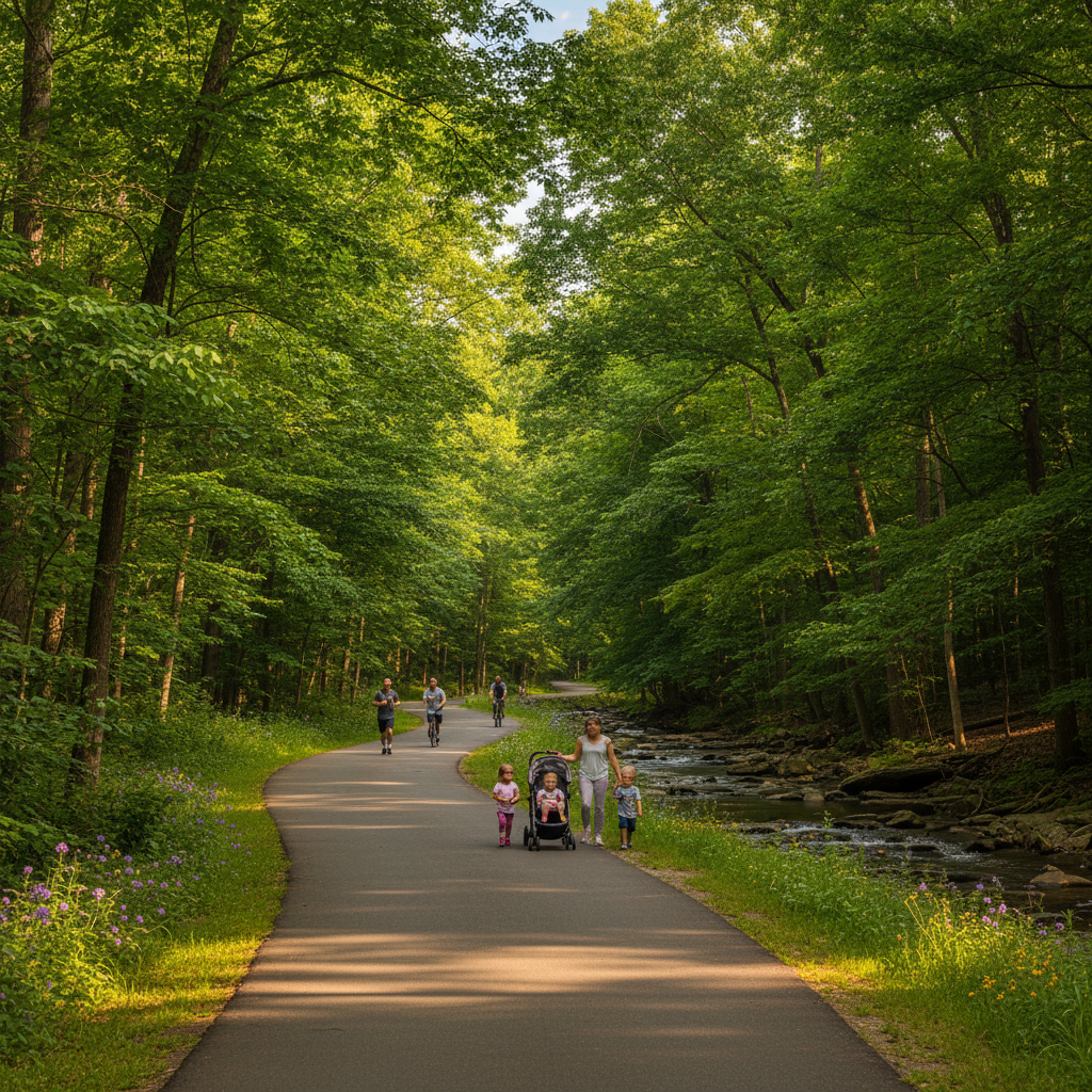 NatureA scenic paved trail perfect for walking, running, and biking that winds through wooded areas and connects neighborhoods. It's a peaceful escape for outdoor exercise and family strolls away from traffic.