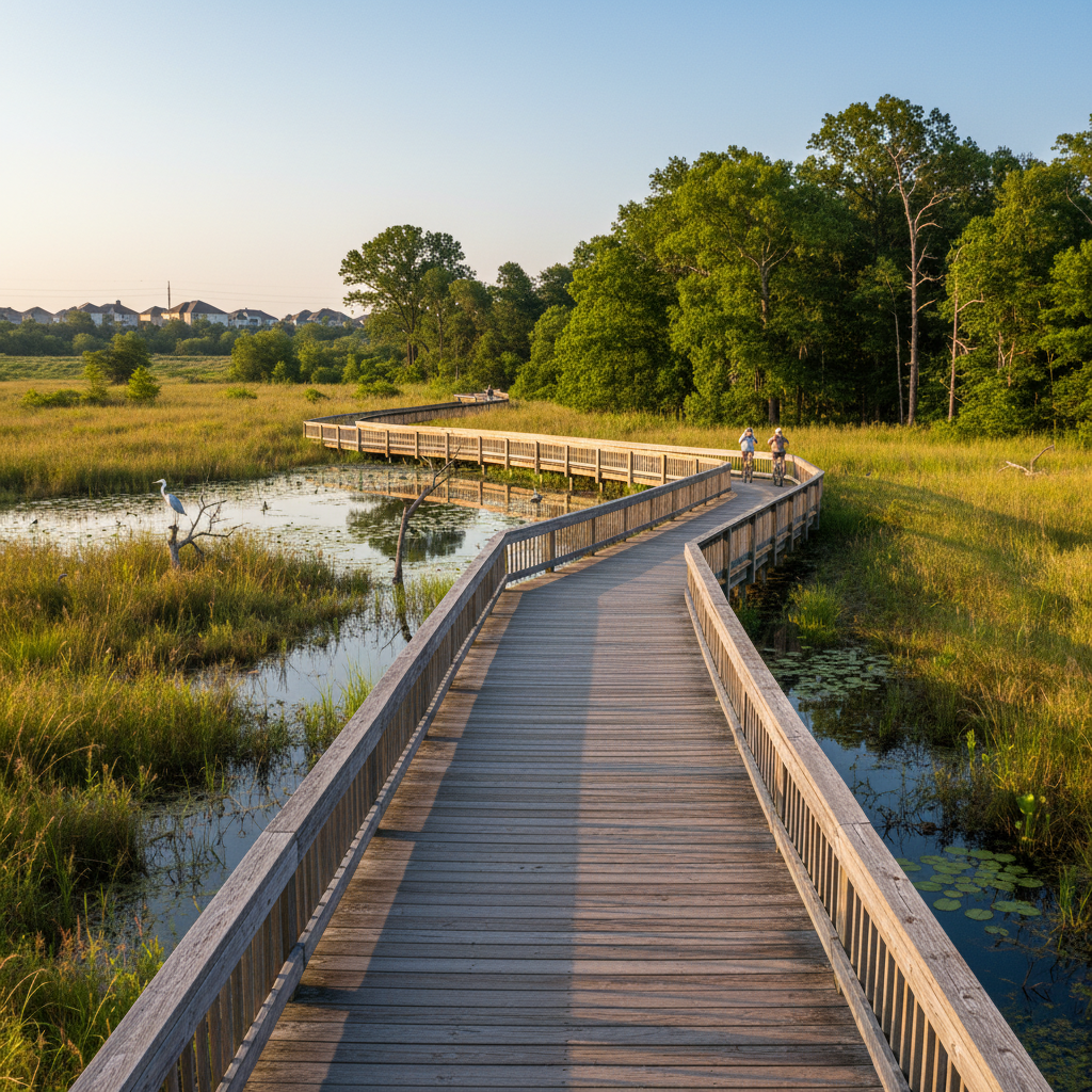 NatureThis extensive trail system winds through wetlands, prairies, and wooded areas, offering peaceful walking, running, and biking paths. The elevated boardwalks provide excellent birdwatching and connect to Pearland's growing network of green spaces.